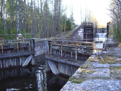 Справка: двухкамерный шлюз расположен на старом русле Сайменского канала. Построен в 1845 – 1856 годах по проекту шведского инженера Нильса Эриксона. После Второй мировой войны для судоходства не использовался. Шлюз уникален тем, что на май 2008 года там сохранились старые деревянные ворота и частично механизмы для впуска и выпуска воды, в то время как на большинстве шлюзов Старого Сайменского канала сохранились только гранитные стенки. Помимо данного шлюза ворота и механизмы сохранились только на шлюзе № 5, расположенном на территории Финляндии.