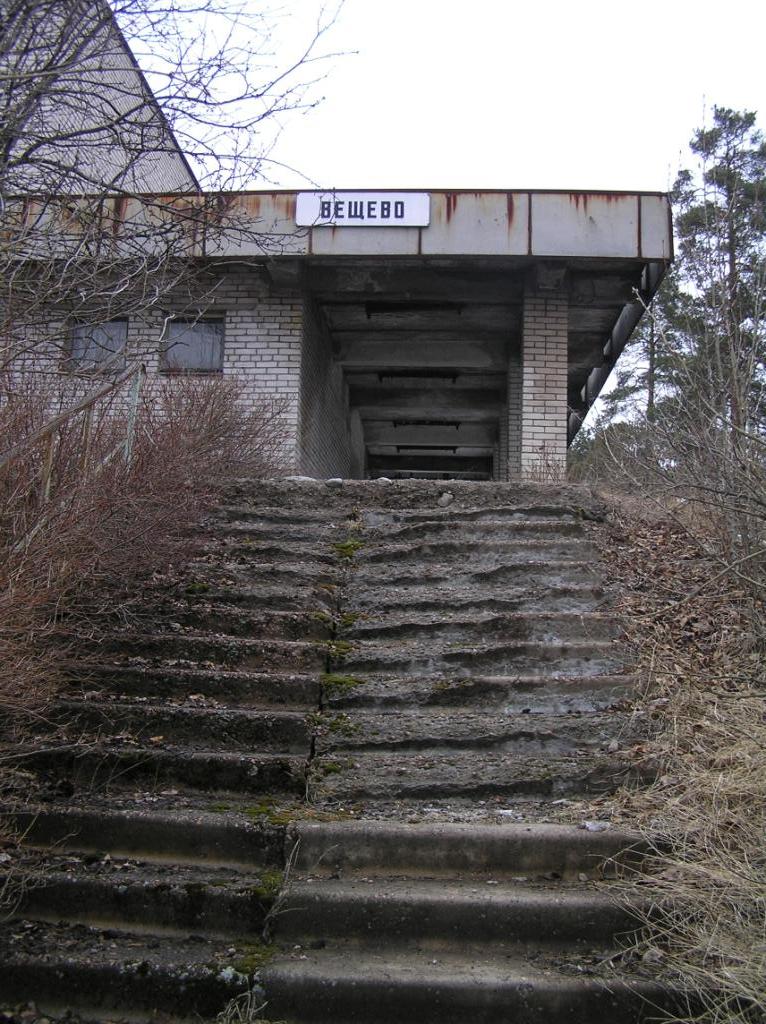 Вернувшись на 5 км обратно, свернули в сторону Житково, Вещёво. В Житково шоссе пересекает отстатки ж.д., из асфальта торчит рельс. Путь к б. станции Житково разобран. В Вещёво у дороги встретили громадный валун с выбитой датой "1927". Поиски какой-либо информации о нём в интернете и литературе успехом, увы, не увенчались.