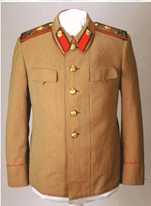 И.В.Сталину был пошит новый костюм. Это был закрытый светло-серый китель с отложным воротником и четырьмя карманами того же покроя, что носили советские генералы до введения погон. Такие же кителя после войны носили советские госслужащие низших рангов. Китель был украшен погонами Маршала Советского Союза и генеральскими шинельными петлицами – красными с золотым кантом и пуговицами. Воротник и обшлага, как обычно, были окантованы красными выпушками. Брюки навыпуск с красными лампасами были сшиты из той же ткани, что и китель. В нем И.В.Сталин изображался на официальных портретах и плакатах.