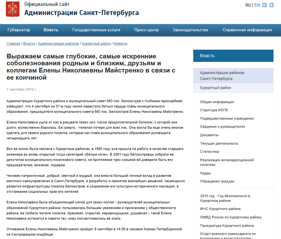 Полный текст:Администрация Курортного района и муниципальный совет МО пос. Белоостров с глубоким прискорбием извещают, что 4 сентября на 57-м году жизни перестало биться сердце главы муниципального образования, председателя муниципального совета МО пос. Белоостров Елены Николаевны Майстренко.