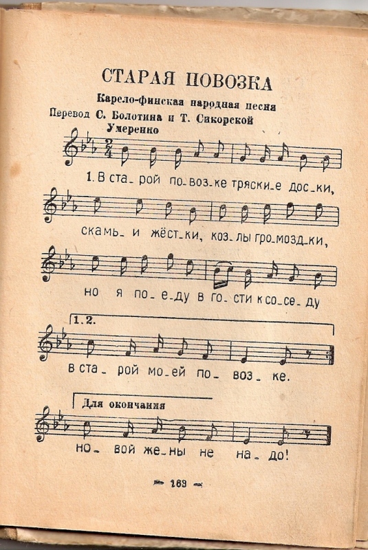 Порядок расположения песен был строжайше идеологически выдержан, о чём можно судить по первым страницам оглавления: сначала про т. Сталина, потом про Родину-мать, затем про борьбу за мир, далее - несколько песен про Москву и одна про Ленинград, ну а после этого - про ударный труд, любовь и дружбу. Отдельной рубрикой - мелодии народностей. Всё тоже по иерархии. Русские, украинские, белорусские, молдавские и т.д. Имеется также карело-финская (sic!) народная песня. В переводе, понятно, только не ясно, с какого языка :P Я её, прочитав слова, вспомнил. Слышал по радио, но не в 1951 г., а гораздо позже, где-то в начале 60-х, и точно помню, что тогда её объявляли как финскую. Что вполне объяснимо: Карело-Финской ССР уже не было, а бывшие белофинны стали "добрыми северными соседями" и ихний фольклор популяризировали.