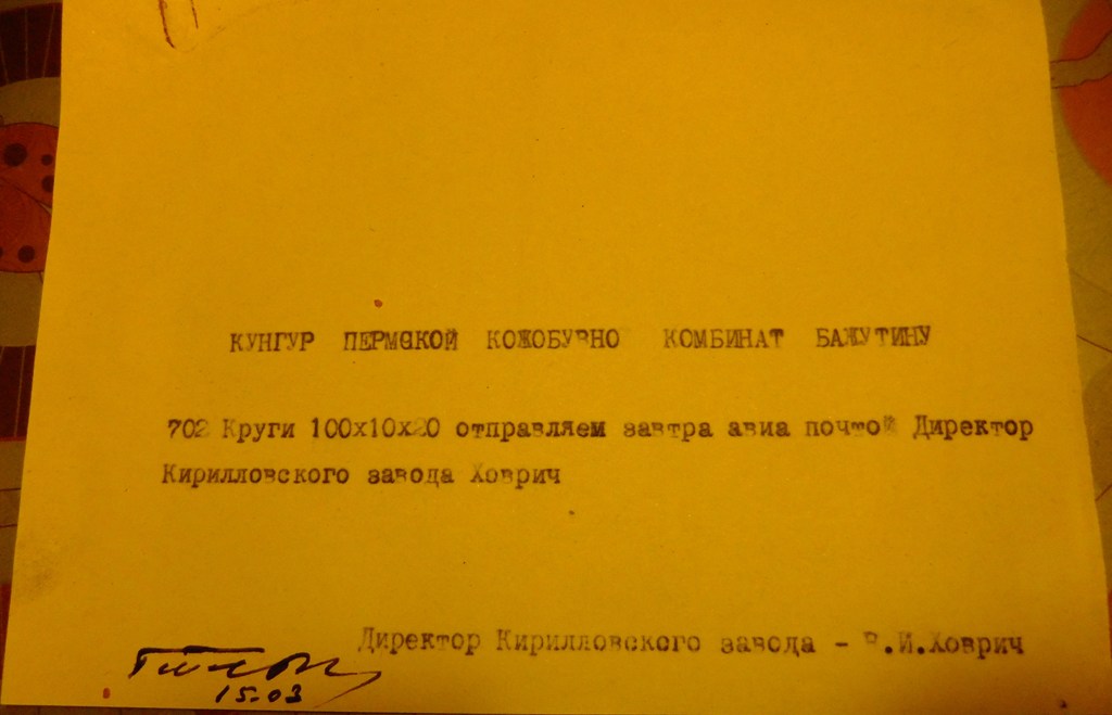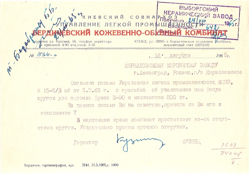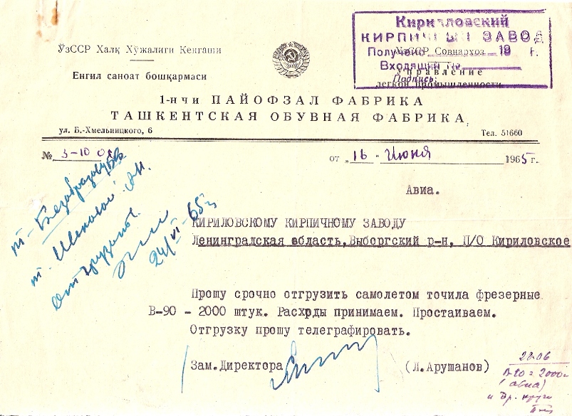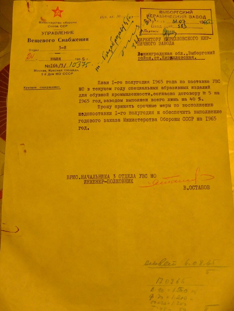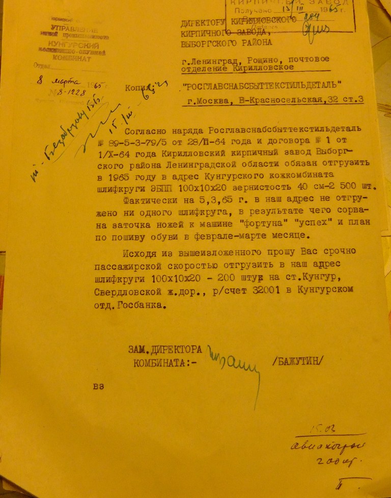 Такое впечатление, что этот маленький заводик в 60-е годы (а стопка документов оказалась из тех лет) был единственным поставщиком абразивных изделий для обувных фабрик по всей стране! И что-то у них реально не ладилось, потому что все письма и телеграммы примерно одного содержания - почему срываете поставки, из-за вас стоит производство. 8O