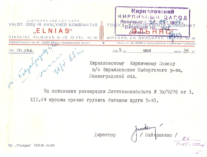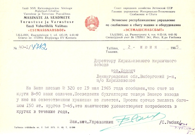 Недавняя экскурсия в пос.Кирпичное (б. Perkjärvi) позволила погрузиться не только в его белофинское, но также и в советское прошлое, следы которого сохранились в архиве б. Кирилловского кирпичного завода в виде целого массива деловой переписки. Заводик, от которого ныне остались одни развалины, в середине 60-х годов "держал за горло" обувную промышленность всего Союза! 8O От Каунаса на западе до Ташкента на востоке, отАрхангельска на севере до Сухуми на юге (это только по просмотренным письмам). Продукцию завода - различные абразивные изделия - что называется, отрывали с руками. Замечателен стиль и лексикон этой переписки, местами напоминающий райкинские интермедии тех лет. Вот лишь несколько примеров.