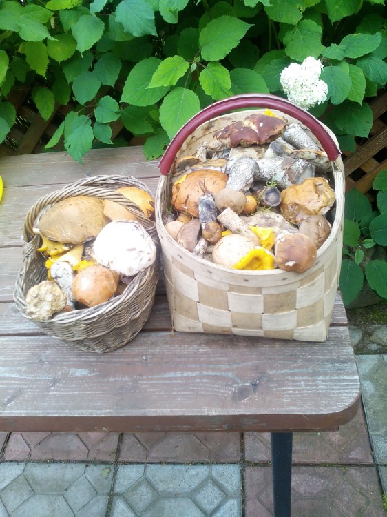Собрал грибков по отдельным проверенным точкам, если просто так ходить по лесу, можно находить лишь одиночные грибы, ежли не нарвешься неожиданно на "плантацию". Красные, преимущественно средние и крупные, есть и мелкие, которые вылезают в самых неожиданных местах. Белых грибов тоже нашел несколько десятков, как обычно в этом сезоне. У большинства червивая ножка, таких же красивых крупных грибов, как в пятницу без червей, нашел лишь несколько. У остальных крупных и средних белых пришлось отрезать ножку, а дома препарировать у некоторых и шляпку. Мелкие белые тоже с червем, как правило. Находишь, ножку долой, шляпку оставляешь. Но! Найдены и идеально чистые грибы без малейшей червивости. Срезал также шляпки у попавшихся по ходу мелких подберей, несколько маслят, штучные мелкие моховики. Маленько собрал волнушки, срезал попавшиеся белые грузди и... готова корзинка с верхом. Кстати, слой белого груздя закончился, можно еще собирать, но придется ходить от гриба к грибу. Из экзотики, на обочинах лесных дорожек срезал несколько рыжиков. Кстати, боровики сегодня тоже частенько встречались на обочинах дорог, в канавках, в т.ч. и крупные.