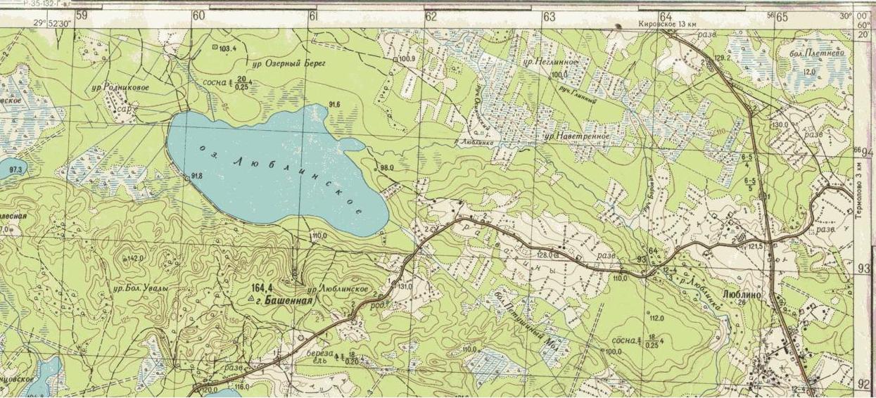 Если взглянуть на соответствующий кусочек нашей послевоенной карты,то на месте прежних деревень увидим, в основном, одни урочища. Правда, пока существует Люблино (б.Hartonen). И дорога чётко обозначена, вероятно ещё "работала". Можно предположить, что деградация этой дороги началась со строительством пересекавшей её бетонки (А120) и закрытием окружающей территории. Тогда же проводилось и очередное укрупнение колхозов, преобразование их в совхозы, а это везде приводило и к запустению небольших деревень. В общем ездить по дороге стало неоткуда и некуда.