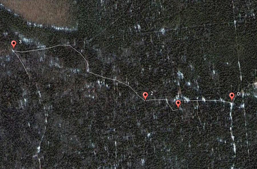 0 - перекрёсток с кольцом. 1 - пересечение ручья. 2 - здесь дорога теряется. 3 - перекрёсток утерянной дороги, дороги от карьера и просеки. Путь вниз - к карьеру. К дамбе - от точки 3 налево, до геодезического знака и направо.
