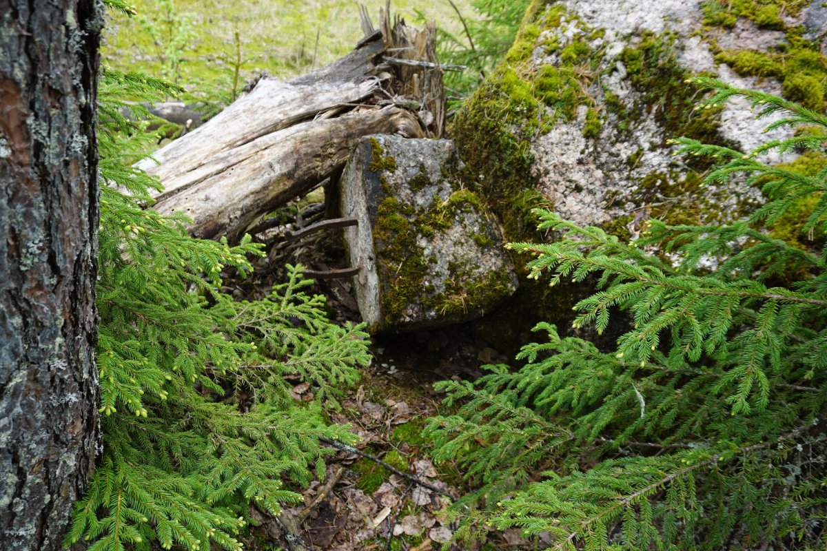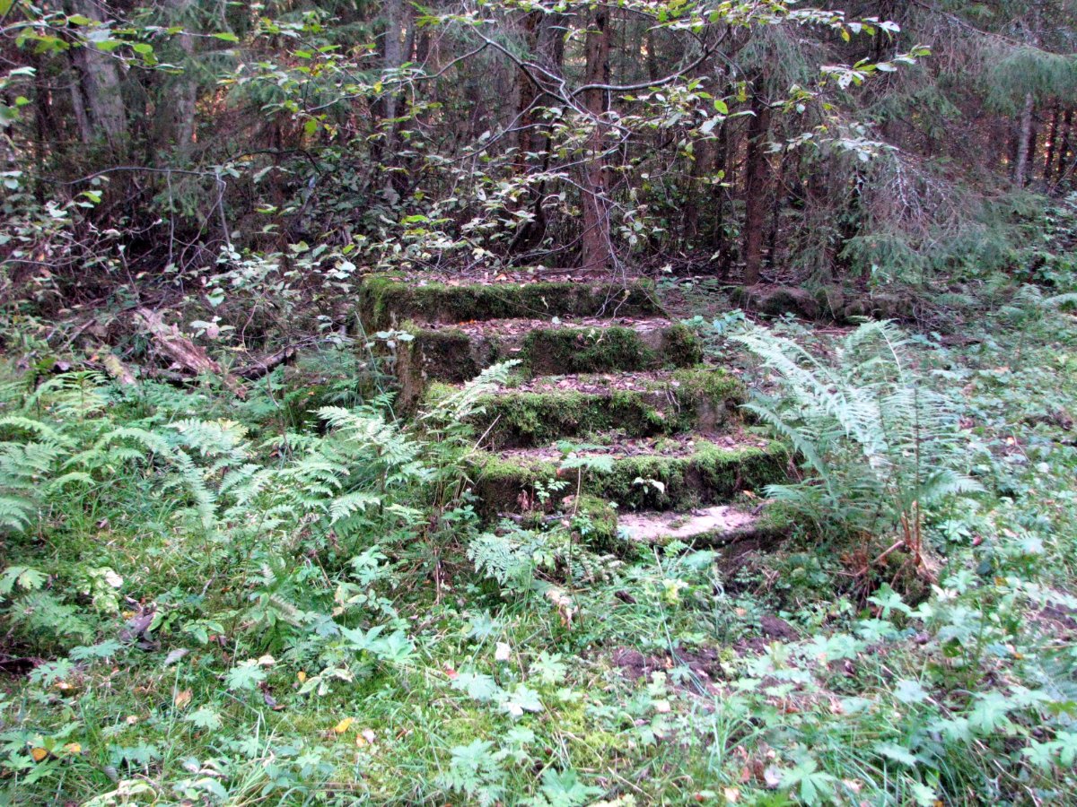 Теперь снова про постройки. Первый фундамент от Сестры, справа, на горке. Самый большой, ну или один из двух самых больших. Рядом с ним, параллельно, лежит гранитная плита, на ней я 10 лет назад подобрал печную дверцу: