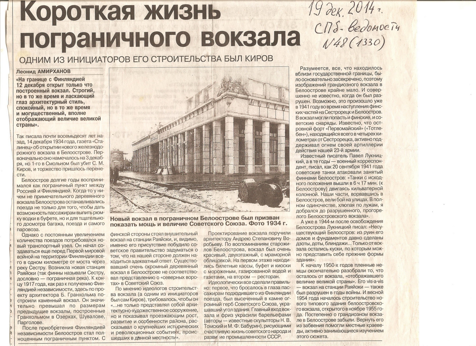 В качестве примера см. статью М. Логунцова "Вокзал, которого не было" опубл. в газ. Сестрорецкие берега" от сентября 2004г. .( см. http://beloostrov.ru/stat_02.html ) и статью Л.Амирханова опубликованную в газ. "Ведомости СПб" от 19 декабря 2014г.