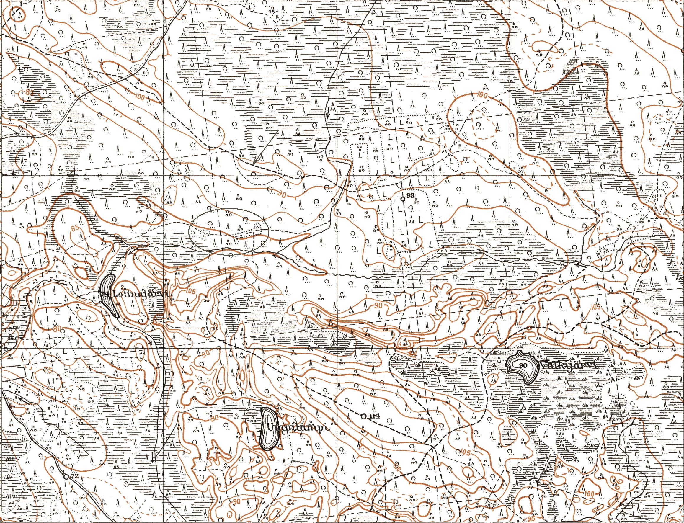 Если посмотреть на финскую карту, то почти сразу после ручья тоже есть перекрёсток и рядом что-то типа "построек". Но это не тот, на который я указывал ранее. Насколько перекрёсток по-вашему далеко от ручья? До него столько же, сколько от ручья до танковой, или гораздо меньше?