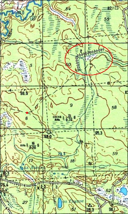 Довольно сложно, дело в том, что ни на одной карте я не нашла лесной дороги от 1 танковой. Эта дорога идёт от пересечения дороги идущей вдоль Глухого озера (справа) с 1 танковой, огибает большое болото с высоким берегом, идёт справа от высокой гряды, затем что-то вроде песочного карьера и затем дорога поворачивает влево, проходит ручей, просеку...Спустя довольно продолжительное время дорога поднимается на возвышенность и вот здесь направо и немного назад от этой дороги идёт заброшенная дорога (она еле видна), на перекрёстке ещё остатки какого-то фундамента и ещё какой-то железный каркас (если он там ещё есть).