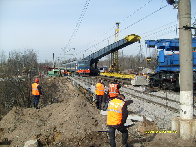 В своем предыдущем сообщении нужно понимать не полное, а частичное закрытие движения на участке Белоостров-Удельная в определенное время суток. Строители перехода сообщили, что они уже давно готовы начать работы в зоне путей, но им не давали "окна". В сентябре им дали эти окна. В расписании на первые числа сентября очень большие изменения. Скорее всего работать будут днем и, предположительно, движение будет закрыто по одному пути. В качестве примера привожу ниже фото, которые были сделаны во время замены 4-х опор и 2-х железных ферм ж/д моста через Сестру. Во время замены старых опор и ферм товарные поезда не проходили.