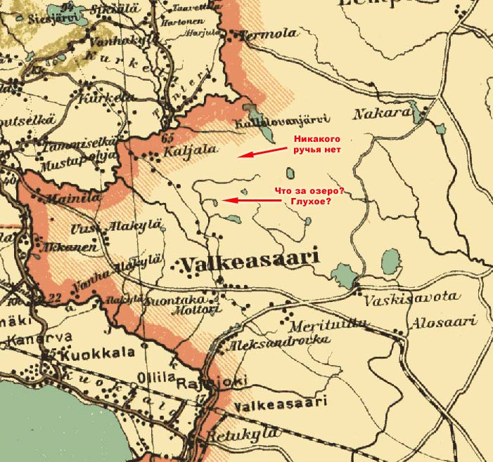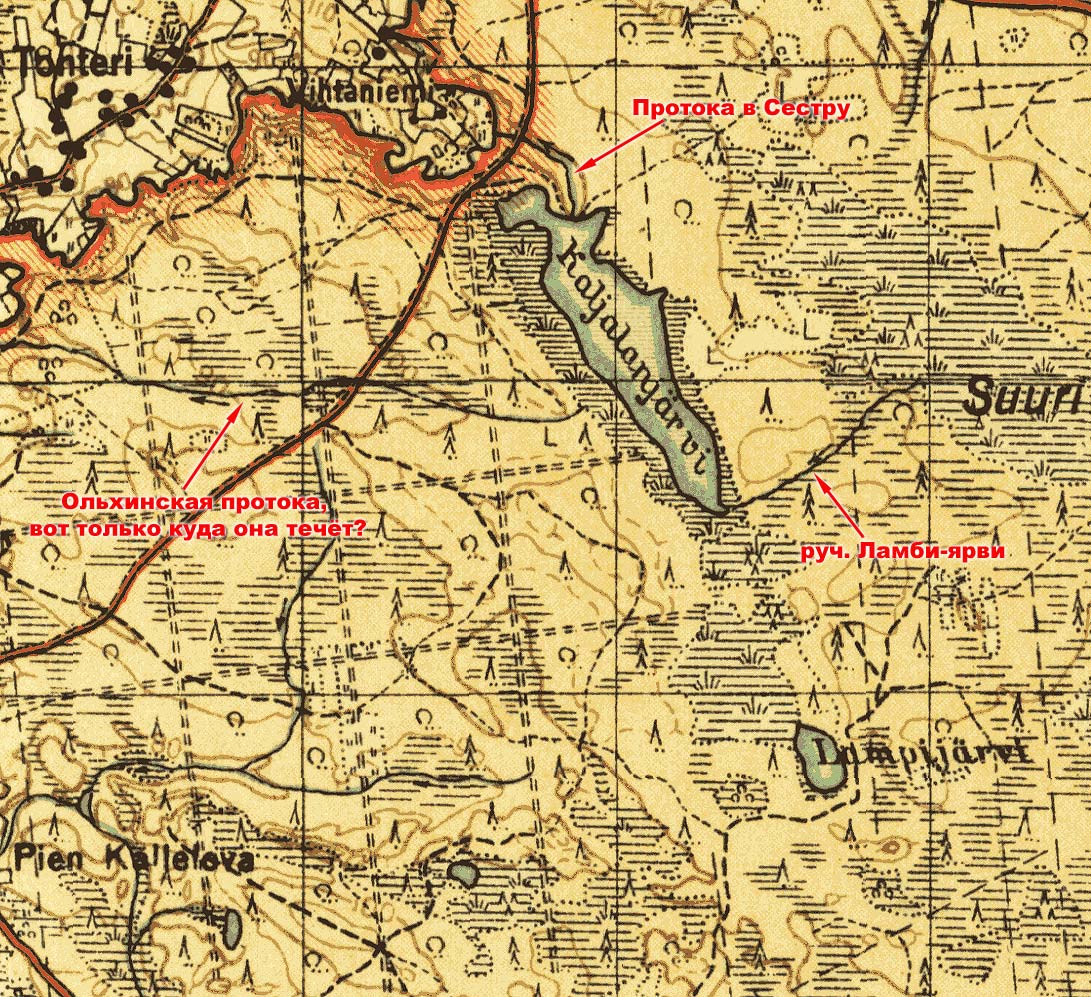 2)на 2й карте таки есть "ольхинская" протока, текущая на юг и сливающаяся в Логина с Саменской, далее - вроде бы все как надо. А та, что на запад и в Сестру, так и она есть на map_skan_kal.jpg (через болото) Вот только ниже по течению, которое"как надо", в "ольхинскую" протоку с востока впадает ручеек, вытекающий как бы из Глухого оз.