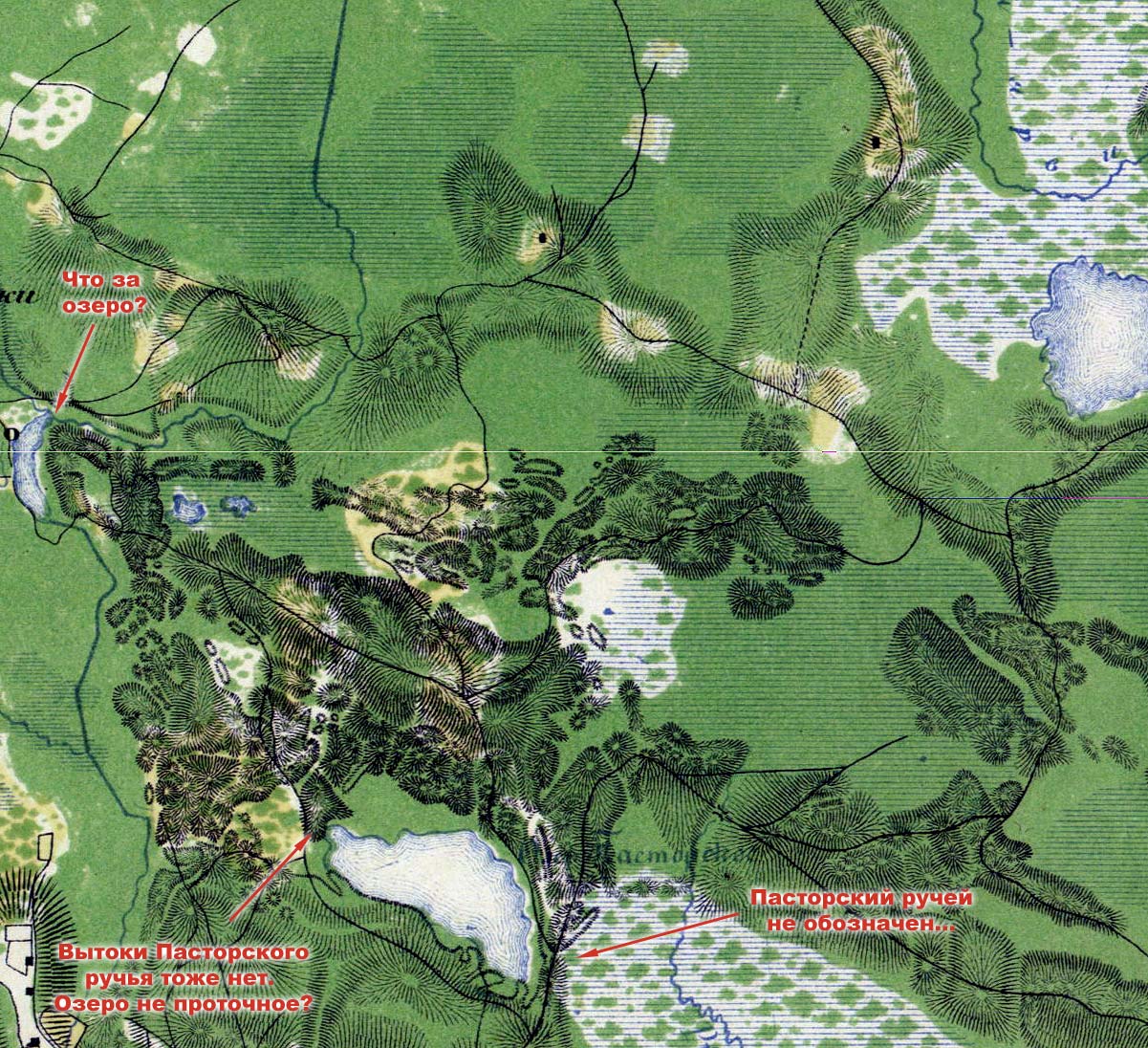 Поставил бы вопрос иначе: почему нет самого Глухого на этой карте, а на более поздних (рассматривавшихся здесь) оно есть, да еще и с вытоком в "ольхинский" ручей?