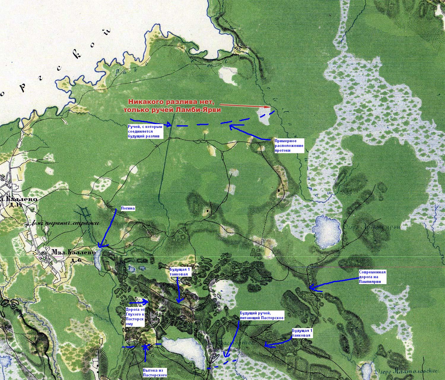4. Удивительно, но на карте 1860 года есть элементы 1 танковой, полностью присутствует дорога от неё до Лампиярви, а так же мост, который на 1 танковой перед поворотом на Лампиярви. Так же, по-моему, есть перемычка, которая от Глухого озера ведёт к Пасторскому. Но вот почему нет самого Глухого?? Это не понятно.