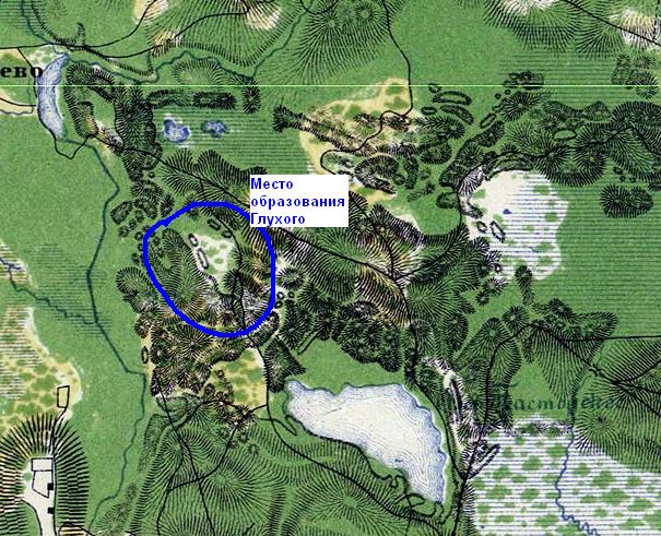 P.S. а на карте 1860г. нет не только Глухого, но и Светлого. А оно образовалось МНОГО лет назад, ибо также немало лет назад оно заболотилось, и полынья, существующая ныне, уменьшилась до 10-15% от бывшей общей площади поверхности озера. Думаю, тут уже ошибки картографов.