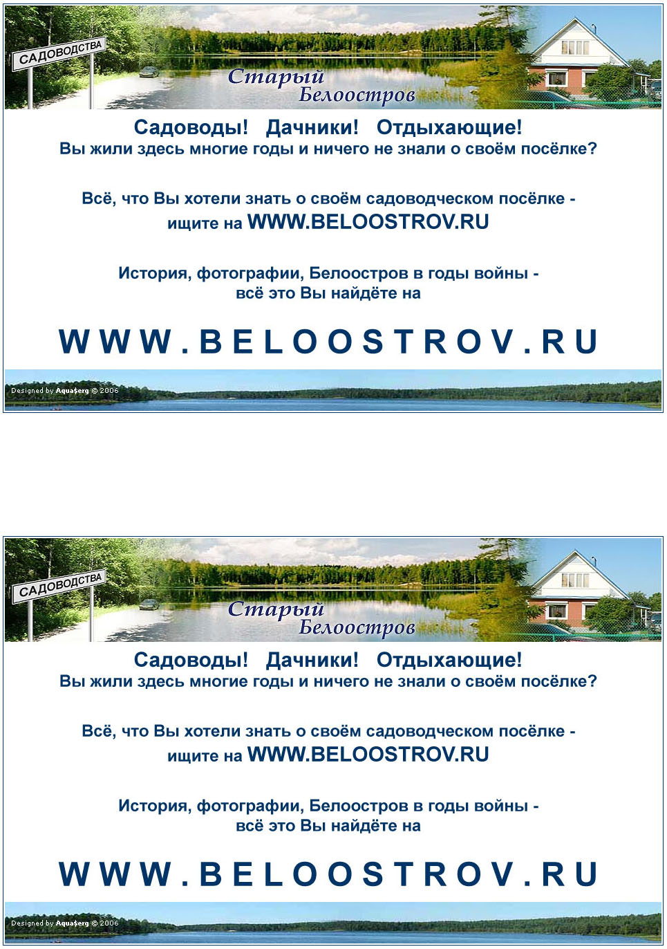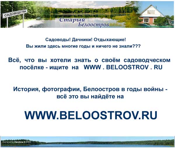 Смысл таков: нужно провести некую промо-акцию по продвижению сайта среди жителей Белоострова. Мои предложения: расклеить объявы на "центровых" местах - автобусных остановках, у магазинов, кафе, на Пасторском озере... Текст примерно таков: "Садоводы! Всё, что вы хотели узнать о своём посёлке - узнайте на WWW.BELOOSTROV.RU"