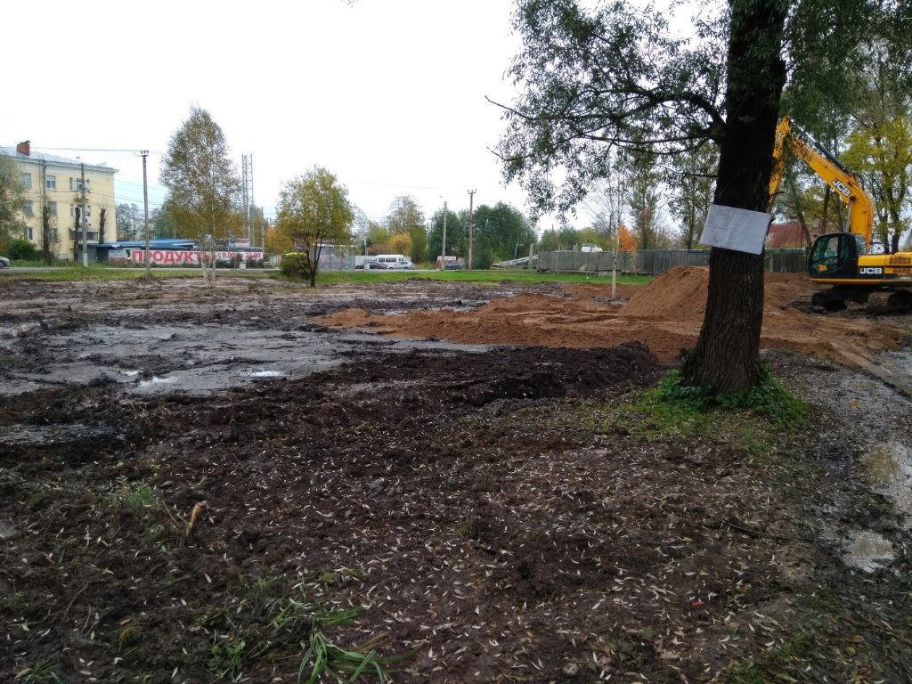 Вырублен кустарник, болотце почти все засыпано. Присутствует экскаватор, несколько нерусских работников)