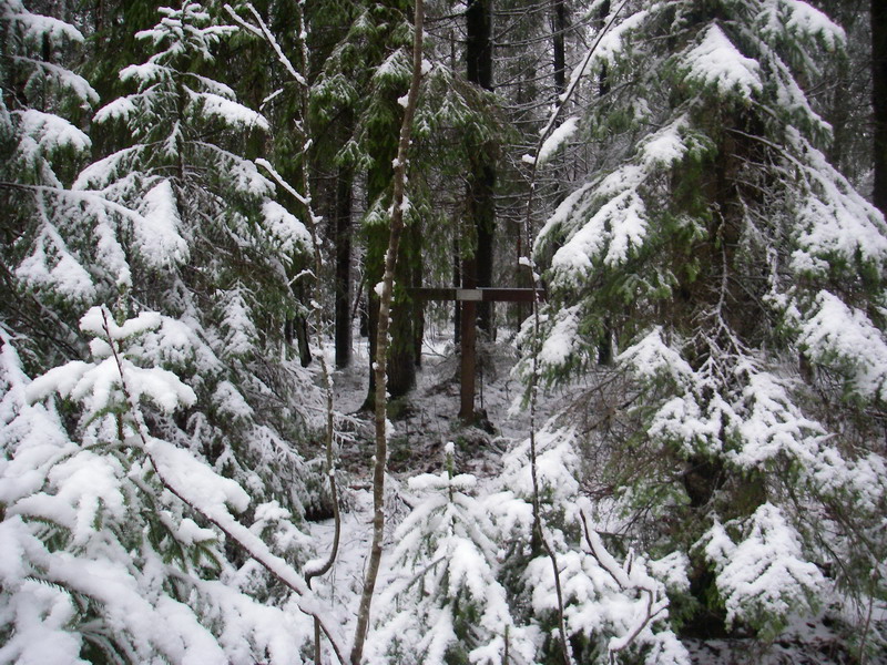 Все лето хотел прокатится мимо Лампиярви, чтобы сфотографировать крест, поставленый финами неподалеку от озера. Проезжал несколько раз, но с собой не было фотоаппарата. Наконец вооружившис фотиком выехал на дачу с байком, и прокатился по первому снегу.