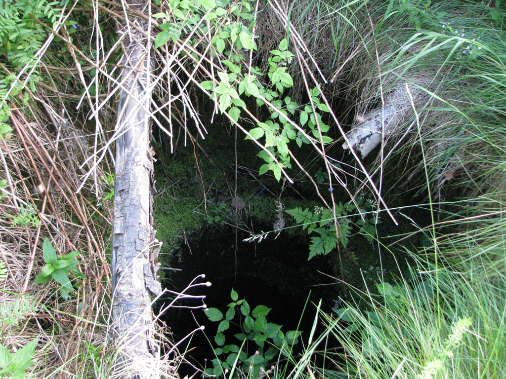 На обратном пути остановились у шведской могилы. Слева за нее идет тропинка. Пошел по ней метров 50. Слева увидел яму. Подхожу – очень глубокий колодец. Метров 15. Такая интересность. Опять же не знаю – есть он на картах или нет. Сижу на даче, ем малину. Карта дома.