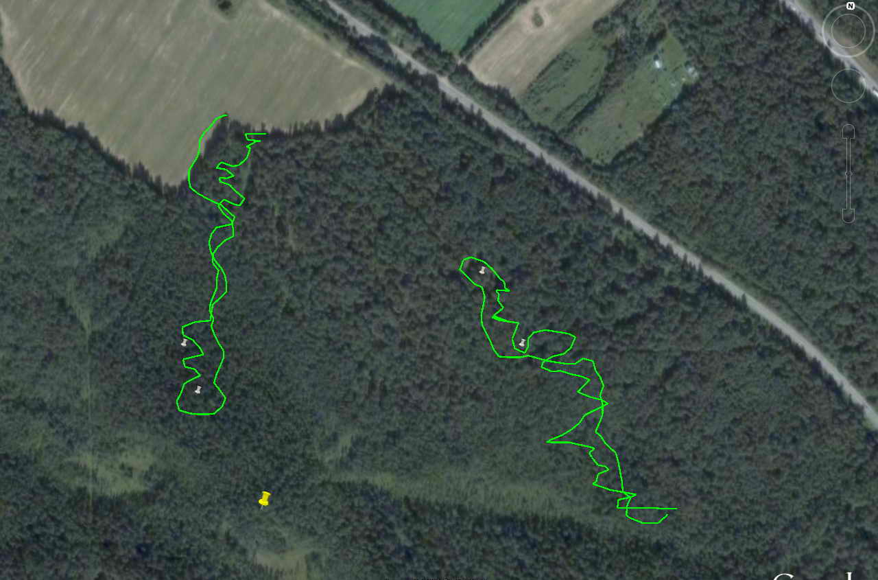 Проехали Сестру, началось садоводство Светлая гора, расположенное на месте бывшей финской деревни. И дальше в полях то тут, то там виднелись домики, вероятно, самозахват. Свет не подведен, воды нет. Как там живут? Километра через 3 от моста, забирая от развилок правее, уперлись в лес. Тут полный аллес капут. До того дорога была проезжей для абсолютно любого авто. Теперь даже военный Урал не справился бы. Разбито в хлам, лужи метров по 40-50. Даже на велосипеде плохо. Первые метров 600-700 пришлось бы нести на себе, продираясь по кустам. Далее колея в виде глубокой синусоиды с амплитудой сантиметров в 60-70. Около полутора км такого безобразия. Ближе к конечной точке нашего маршрута дорога стала улучшаться. Подошли к перекрестку. Прямо - к броду перед Термолово. Налево, вероятно в сторону Люблинского озера ( оттуда вело много следов квадроциклов). Вправо, вероятно, к Сестре. Карту еще не смотрел. Здесь дороги очень хорошие. Даже авто проедет. Прошли перекресток, идем прямо. Метров через 70-80 слева показался памятник – хвост самолета. Координаты места 60 17 32,2 30 01 37,5.