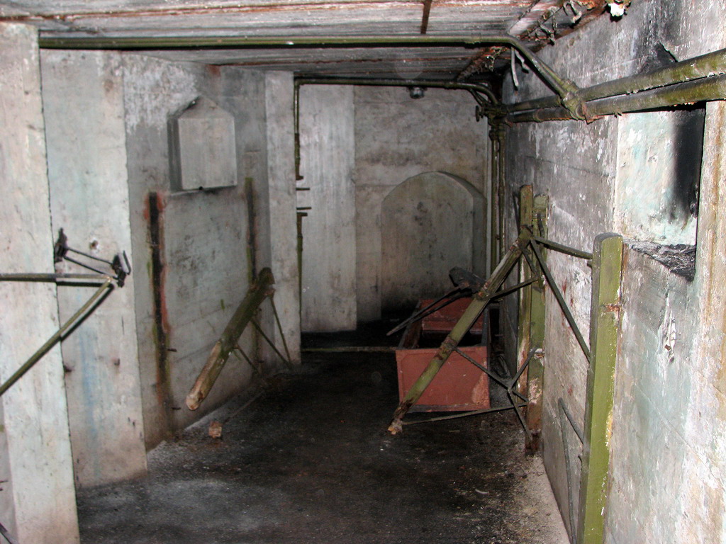 Следующий дот выдвинут ближе к передовой. Видимо, недооборудованный. Представляет из себя помещение в один боевой каземат. Находятся амбразуры: под арт орудие ( миллиметров на 45), две пулеметные и одна, вроде, как ружейная. Имеется труба под перископ. На покрытии есть прямоугольный вырез, вероятно, под наблюдательную башенку. Башенки уже, конечно, нет. Дот обложен булыжниками и обсыпан землей. Кое-где обсыпка и булыжники нарушены. Труба перископа пробита пулями. Недалеко есть непонятная металлическая конструкция. Используется местными грибниками в качестве обеденного стола. Вокруг россыпи яичной скорлупы.