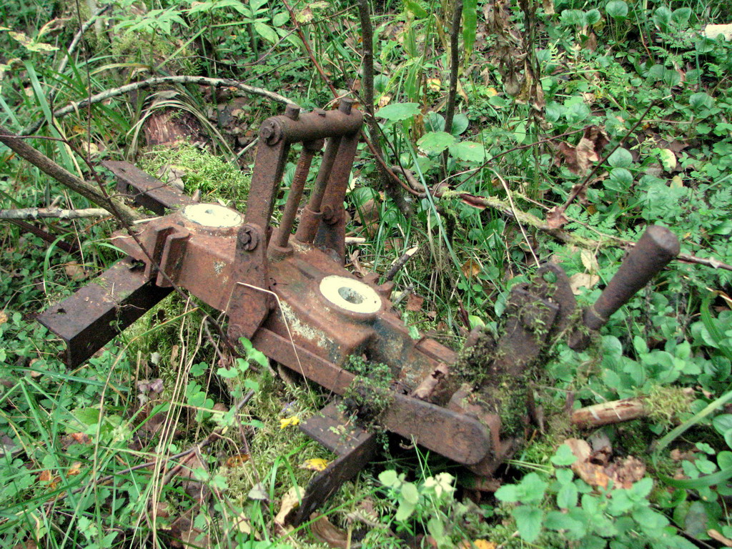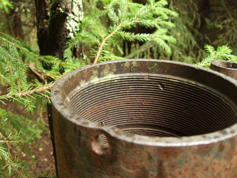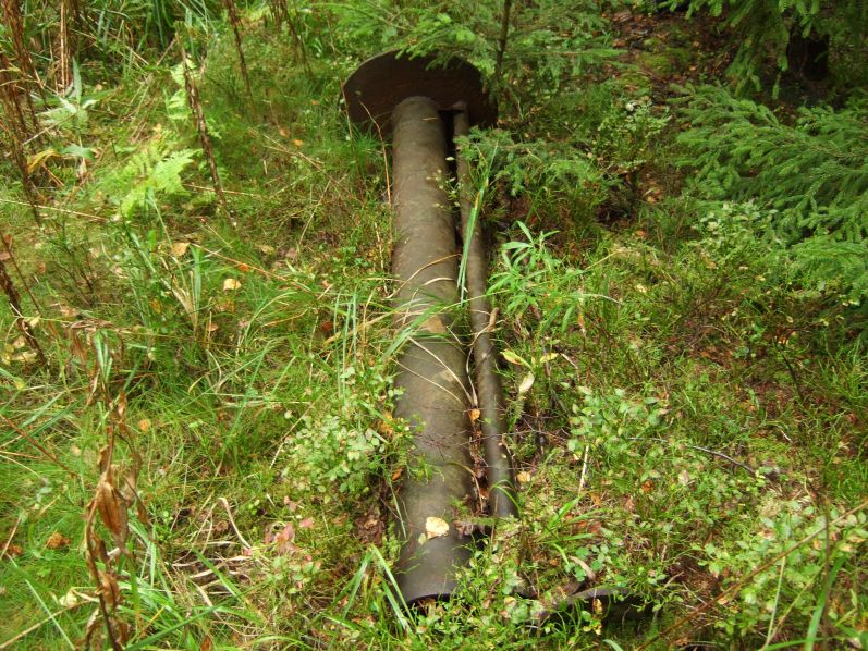 Что можно рассказать коллегам. Все три найденных дота расположены в торцах неких водных рукавов. Напоминает пт артдот в Мертутьском БРО, расположенный в конце пт рва. Ну, может быть, один из них находится вдоль водной канавы. Про эту канаву я еще расскажу. Итак, первая находка представляет из себя обсадную трубу от перископа. Все лежит в комплекте с нижней рукояткой и верхней захлопкой. Лежит прямо посредине леса и дотов в ближайших метрах 500 не наблюдается. Зато наблюдается метрах в 10 разрушенный и раскопанный дзот. По крайней мере большую груду камней иначе идентифицировать нельзя. Труба получилась тяжелая и металлисты не смогли донести ее до своего транспортного средства. Получается, что перископы устанавливались и на дзотах.