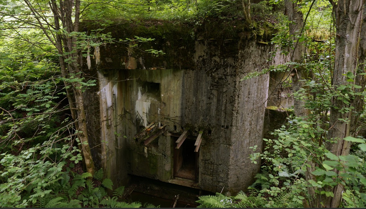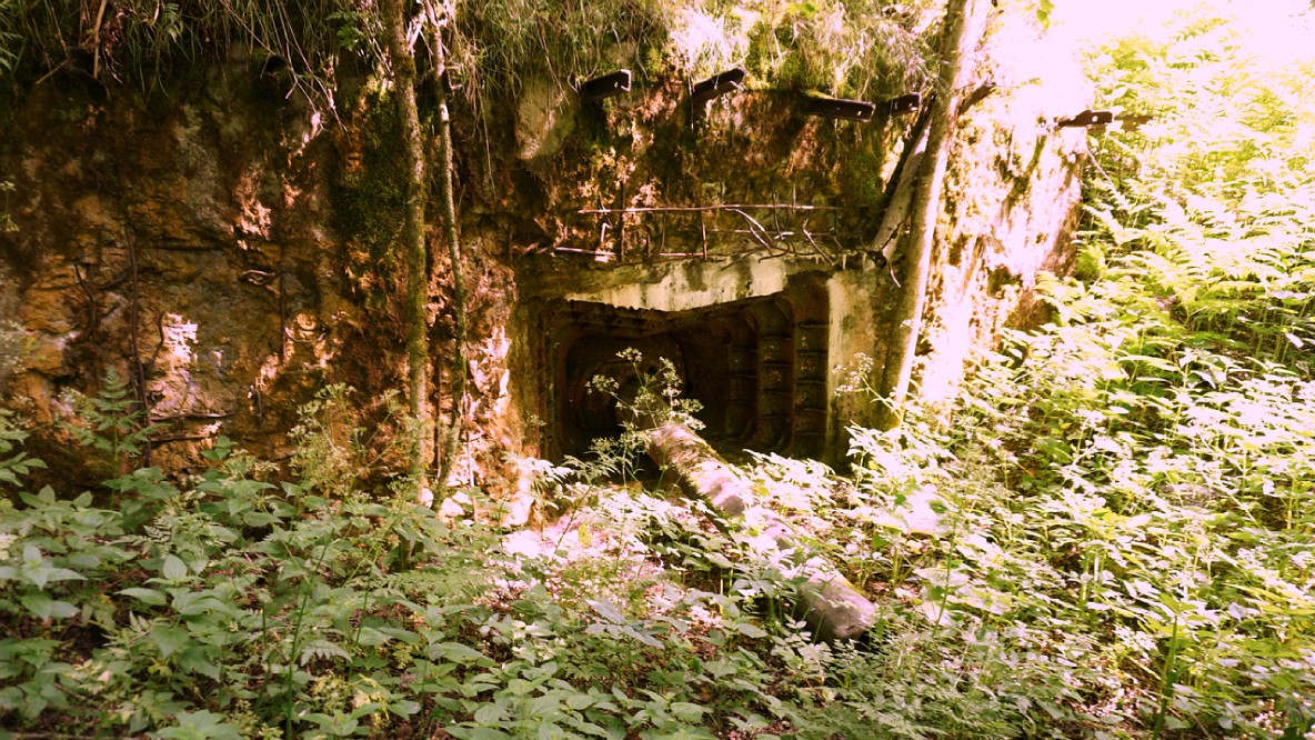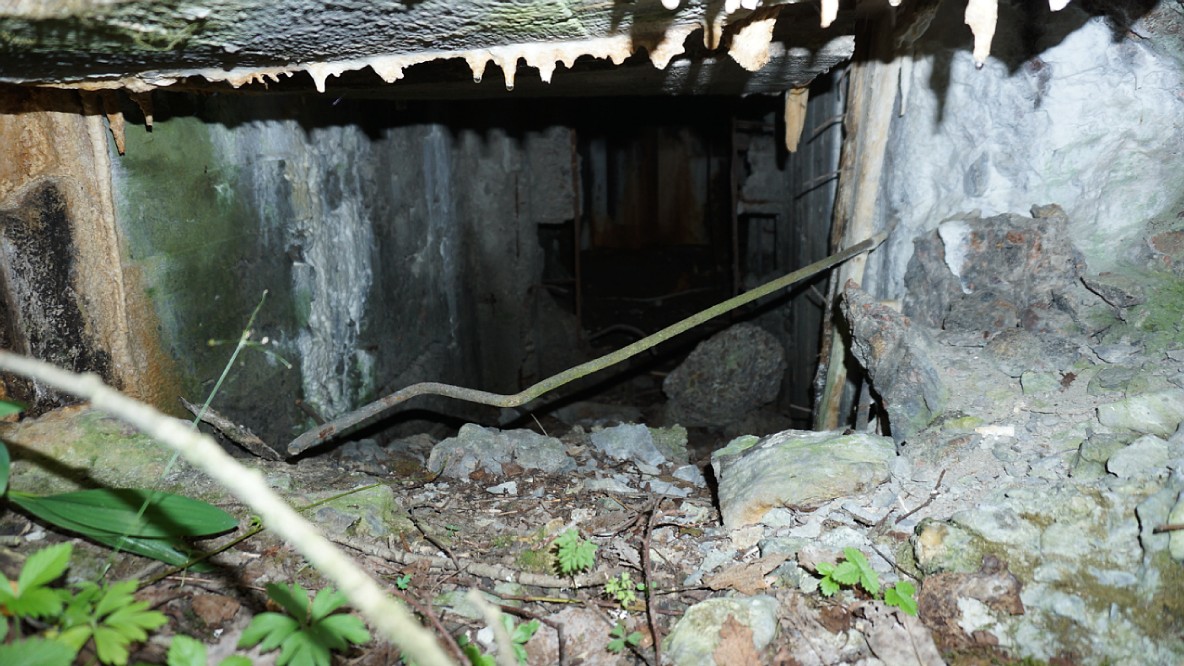 Еще дот один. Внешний вид похож на предыдущий. Все в дырках, бетон сколот, арматура торчит. Интересен тем, что к фланкирующей юго-западное направление пушке, добавлена фронтальная пулеметная амбразура. Зарос по самые помидоры. Не виден даже с пяти метров