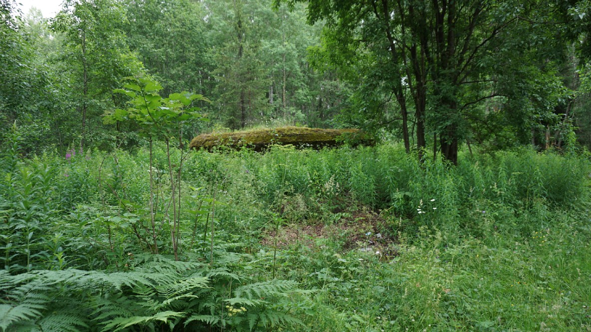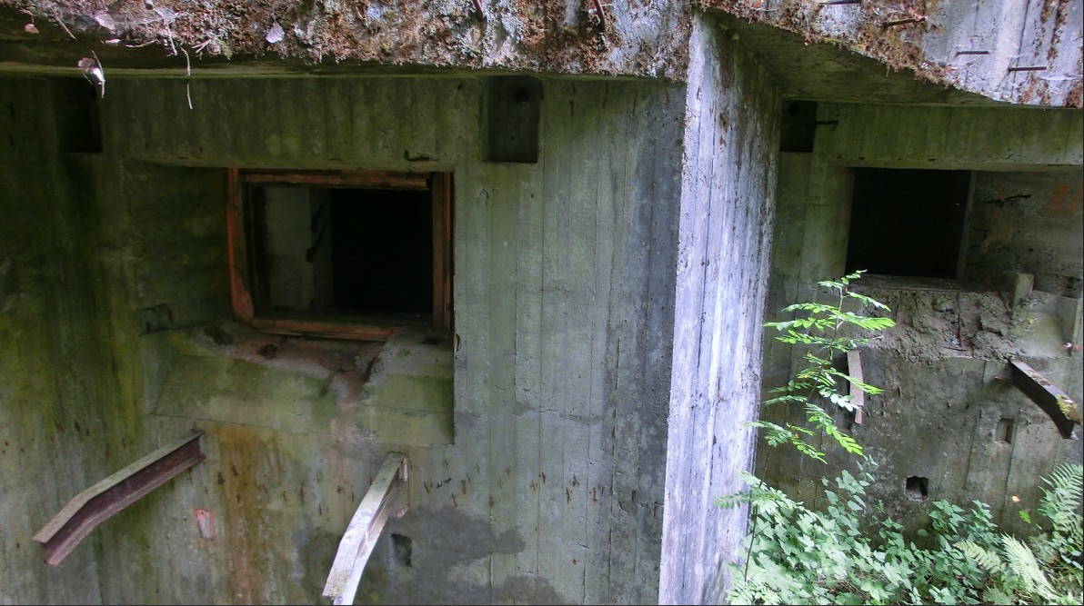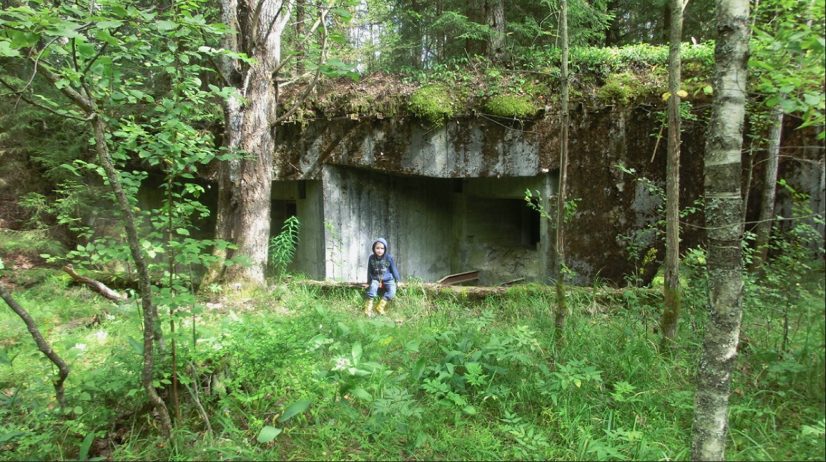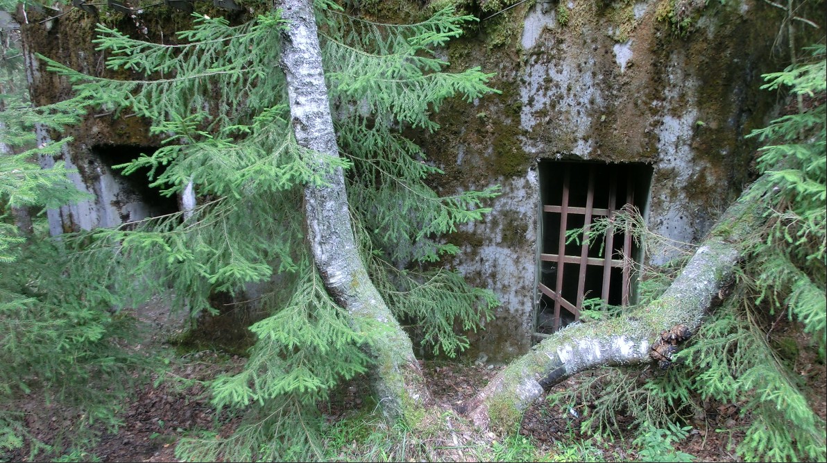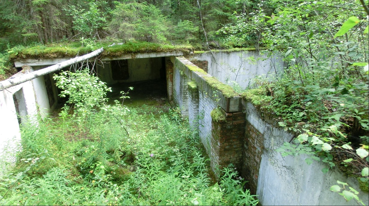 Следующий дот ну ооочень интересный. С многочисленными повреждениями. Бетон слабый, крошится. Арматурная металлическая решетка торчит из всех щелей. Постройка начала войны. Амбразуры фланкируют северное направление. Но и на них много повреждений. Финны могли по ним стрелять только из района каких-нибудь Рюне-мяки. А это километра 4. Снайпера что-ли? Есть еще одна фронтальная амбразура, которая сейчас имеет жалкий вид
