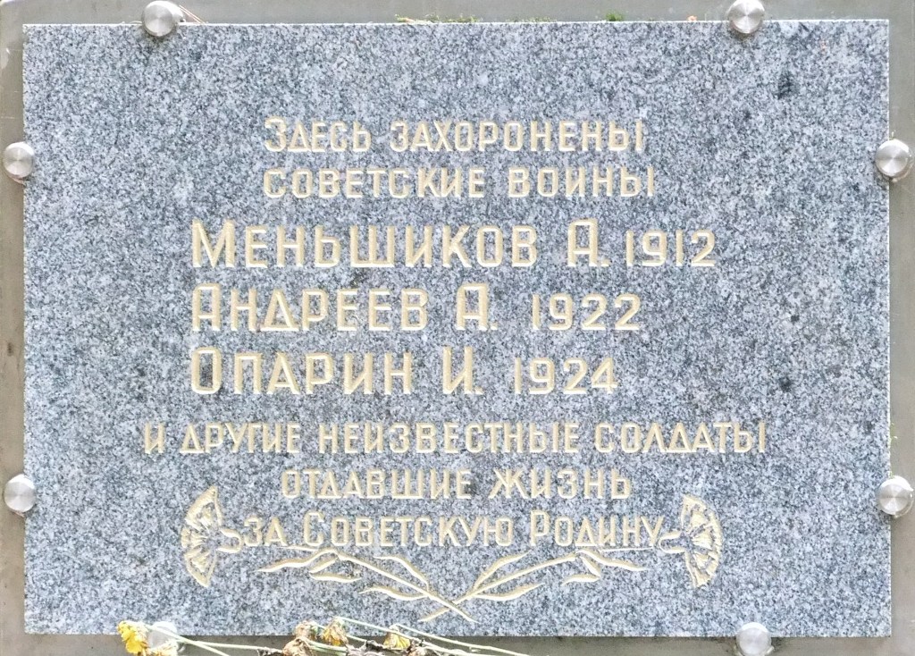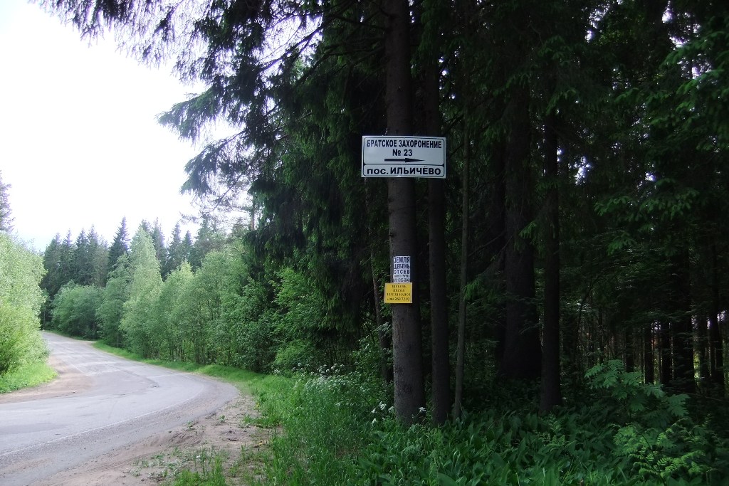 По дороге из Огоньков в Ильичёво встречается типовой (для Выборгского р-на?) указатель места воинского захоронения. К нему ведёт хорошая, проезжая, но не сквозная, лесная дорожка. Справа расположены дачные участки, но хлама никакого не видно. Площадка вокруг братской могилы прибрана, поставлены скамейки. В общем, порядок. Понятно, что только что прошли праздники, но хочется верить, что и дальше так будет.