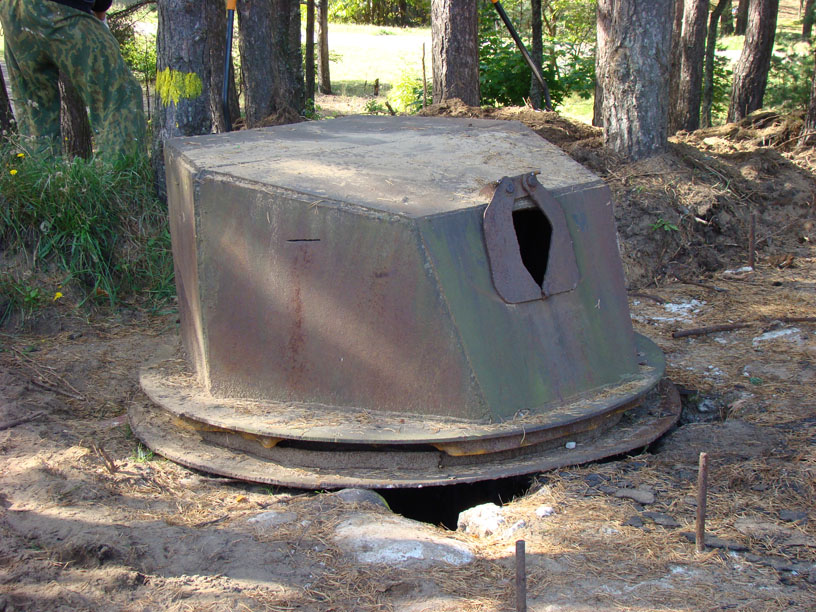 Полевая коллекция у ДОТа пополнилась. Привезена и установлена огневая точка на базе танка Т-28 с Меднозаводского БРО. Над аварийным выходом вместо утраченной бронебашни теперь красуется т.н. "Ижорская башня" под пулемет "Максим". Недалеко от ЖБОТов поставили еще одну стремную башенку - наблюдательный пункт, сваренный из пехотных бронещитков.
