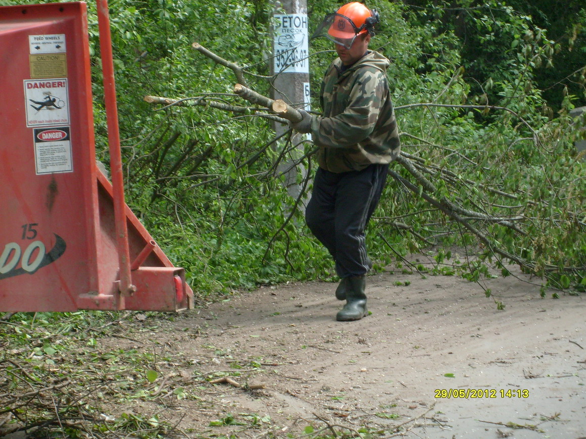 На фото показаны отдельные этапы переработки частей спиленных деревьев.