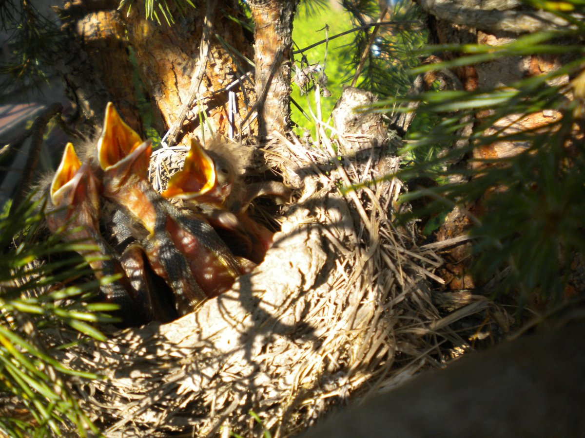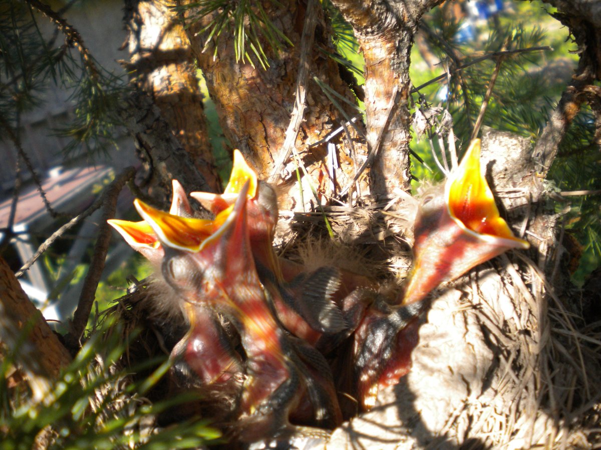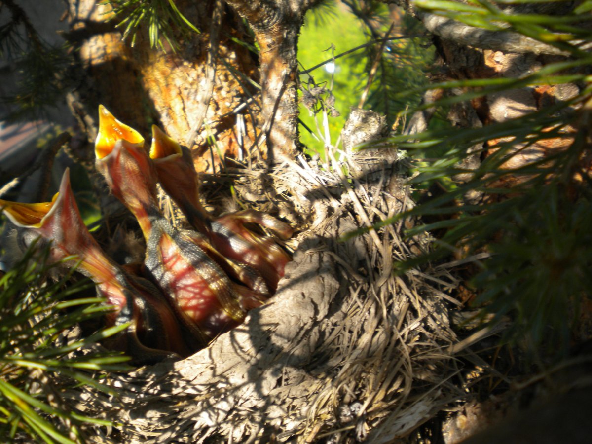 Тема про птиц,вот и пригодилась Какая-то птица,серая,побольше скворца(идентифицировать пока не удалось)свила гнездо прямо на участке на одной из сосен.Теперь у нас вот такие персонажи живут,а она им без устали таскает вкусных червячков