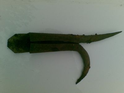 Разобрав на участке штабель деревяшек возрастом более 30 лет среди разных труб обнаружил вот такую железяку. Не сразу сообразил, что это наконечник багра (точнее - "багор пожарный насадной"). Смутили необычно большие размеры изделия: габариты - 45х23 см, вес - 1,5 кг. А главное, посадочный диаметр для насаживания на шест - 7 см! Чтобы не только поднять, но и оперировать с земли таким практически бревном на крыше горящего дома, нужен явно не один человек.Aqua$erg писал(а): 1. Багор