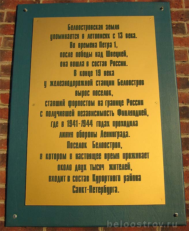 Да, текст на табличке весьма конспективен в средней части, с конца 19 века по 1944 год, все в одном предложении. Получается, что строители поселка дальновидно предусмотрели и грядущую независимость Финляндии, и оборону Ленинграда. Автор явно незнаком с beloostrov.ru.
