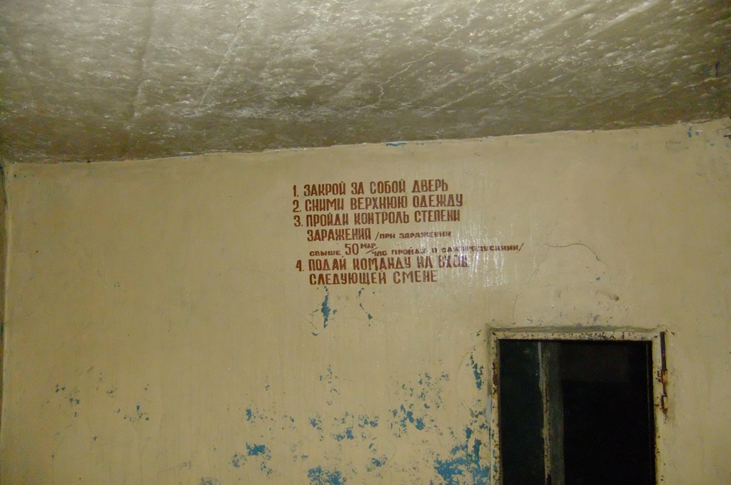 Итак, это база войск РХБЗ (радиационной, химической и биологической защиты), о чём свидетельствует надпись, сделаннная посещавшими это место сталкерами, а также найденная уже post factum дома