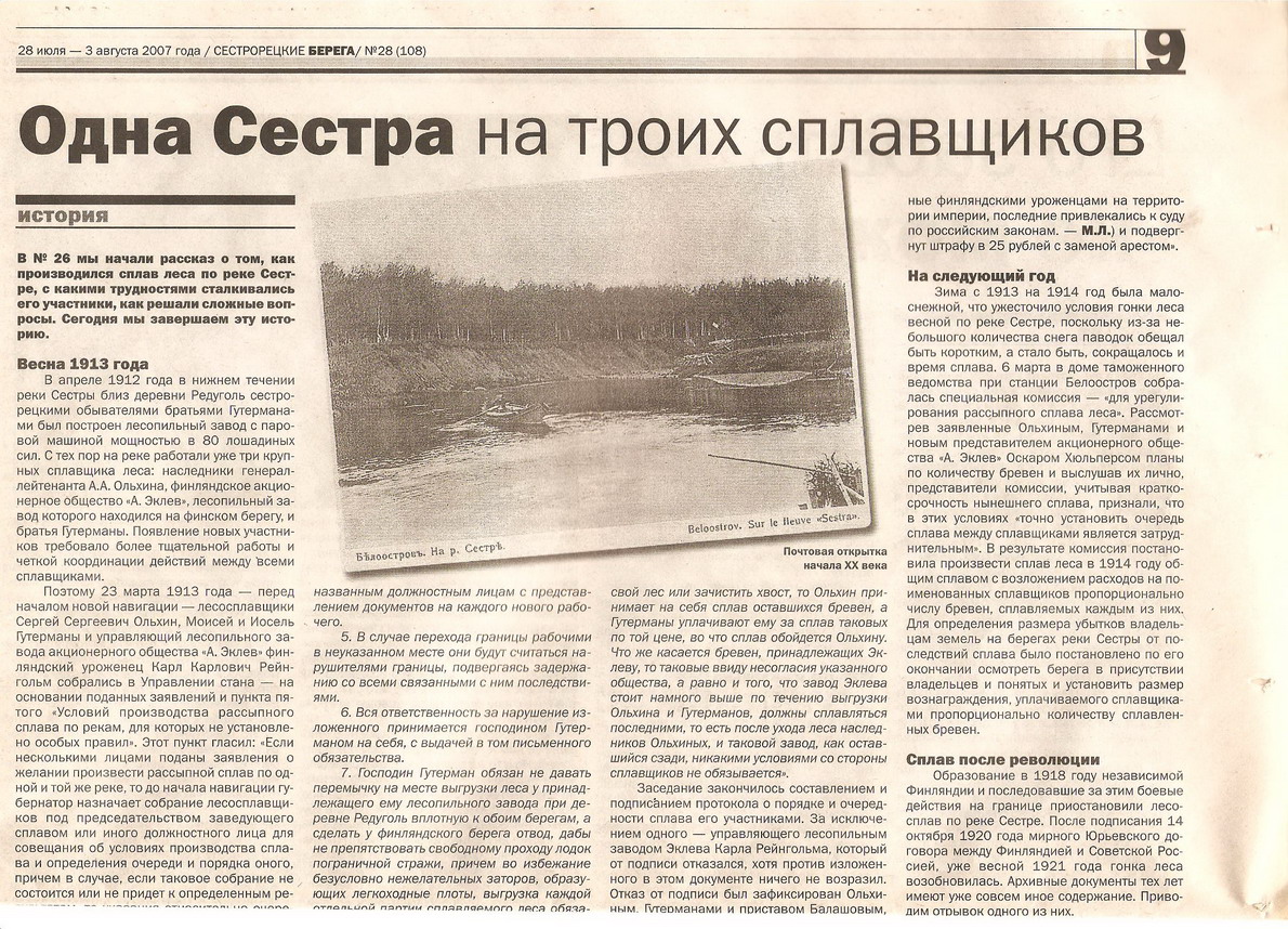 Уважаемый TUOMAS, поищу, где это я видел. А пока навскидку быстренько препровожу Вас по вот такой ссылке http://linturi.vuodatus.net/blog/198658 ... manmonttu/ Что-то про Белоостровское чудо. Люди на лодке катаются. Неужели по Сестре?