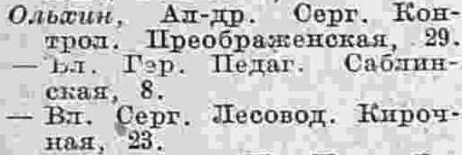 После революции упоминаются лишь дети Сергея – Александр, Борис, Юрий и Владимир. Никакого дома на Сергиевской ул. нет. Борис и Юрий проживают на Васильевском острове. Владимир проживает на Кирочной ул. 23, в доме Елены Сергеевны Оппель (Ольхиной), вдовы хирурга Владимира Оппеля, основателя Мечниковской больницы. Она – персональный пенсионер, и жилплощадь видимо сохранена ей за заслуги мужа. Очевидно, она единственная из Ольхиных, кто после революции остался жить там, где жил. Александр до ареста жил неподалёку – на Преображенской ул. 29 – это ул. Радищева.