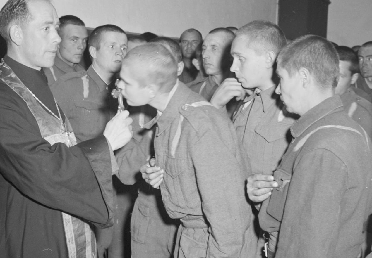 Теперь вот такие две фотографии. Кто разбирается в попах? Это православный священник или финский - кто там у них...? Крест наш, надо его целовать? Крестится боец справа по-православному - это видно. Если поп финский то это что, в их веру хотят перекрестить?
