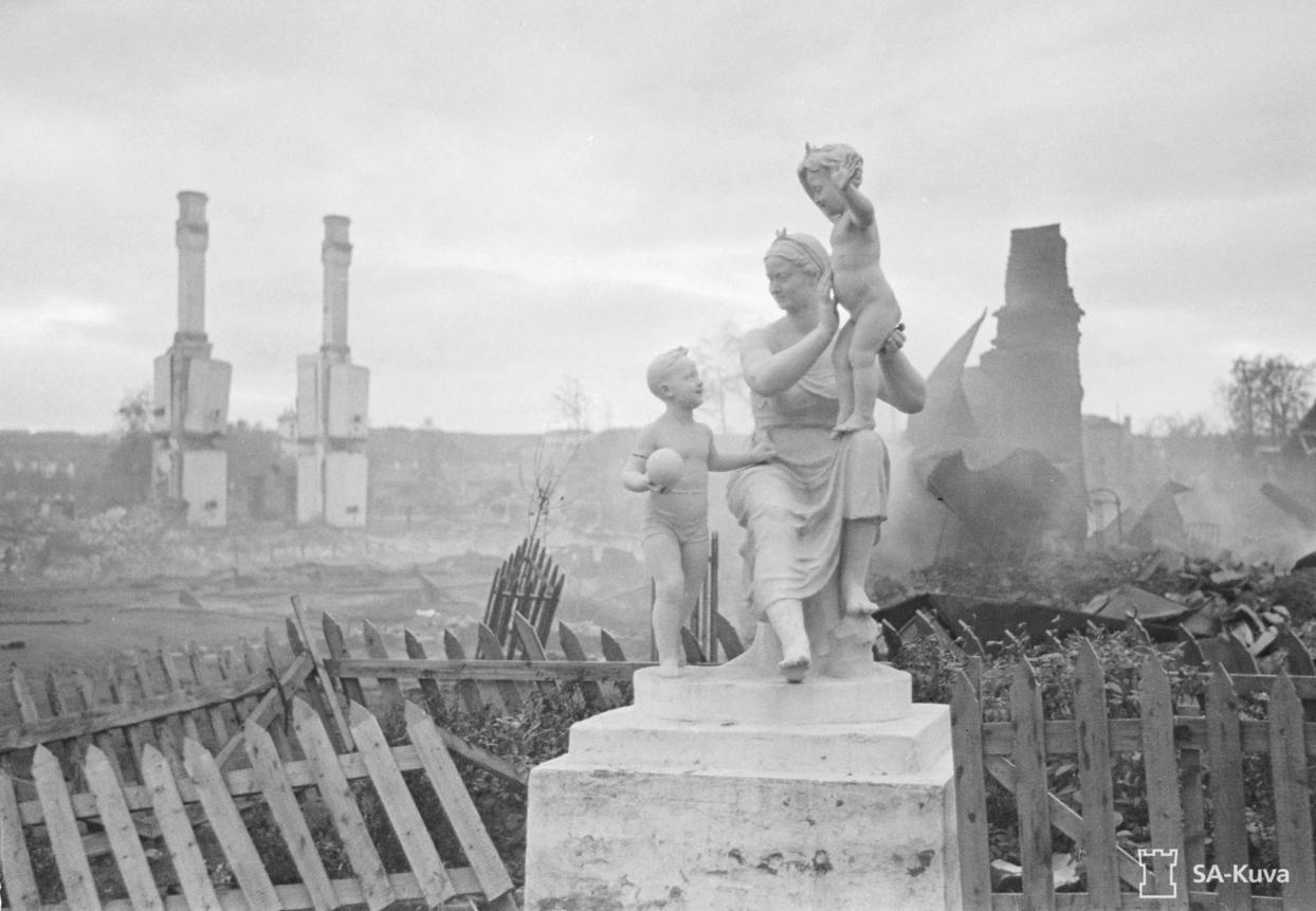 На последнем фото скульптура матери и детей. Очень показателен задний план - разрушенные и сгоревшие жилища. Это Петрозаводск. Съемки начала октября. Все статуи в нормальном состоянии, никто не упражнялся на них в стрельбе. Еще можно посмотреть скульптуры в Петрозаводске - 52449,...480,54075 - точно такая же скульптура пограничника, как в Ряйсяля. Одинаковая стандартная гипсовая отливка. Как, впрочем, и показанная выше парочка Сталина-Ленина. Еще 54305,..306,307,308