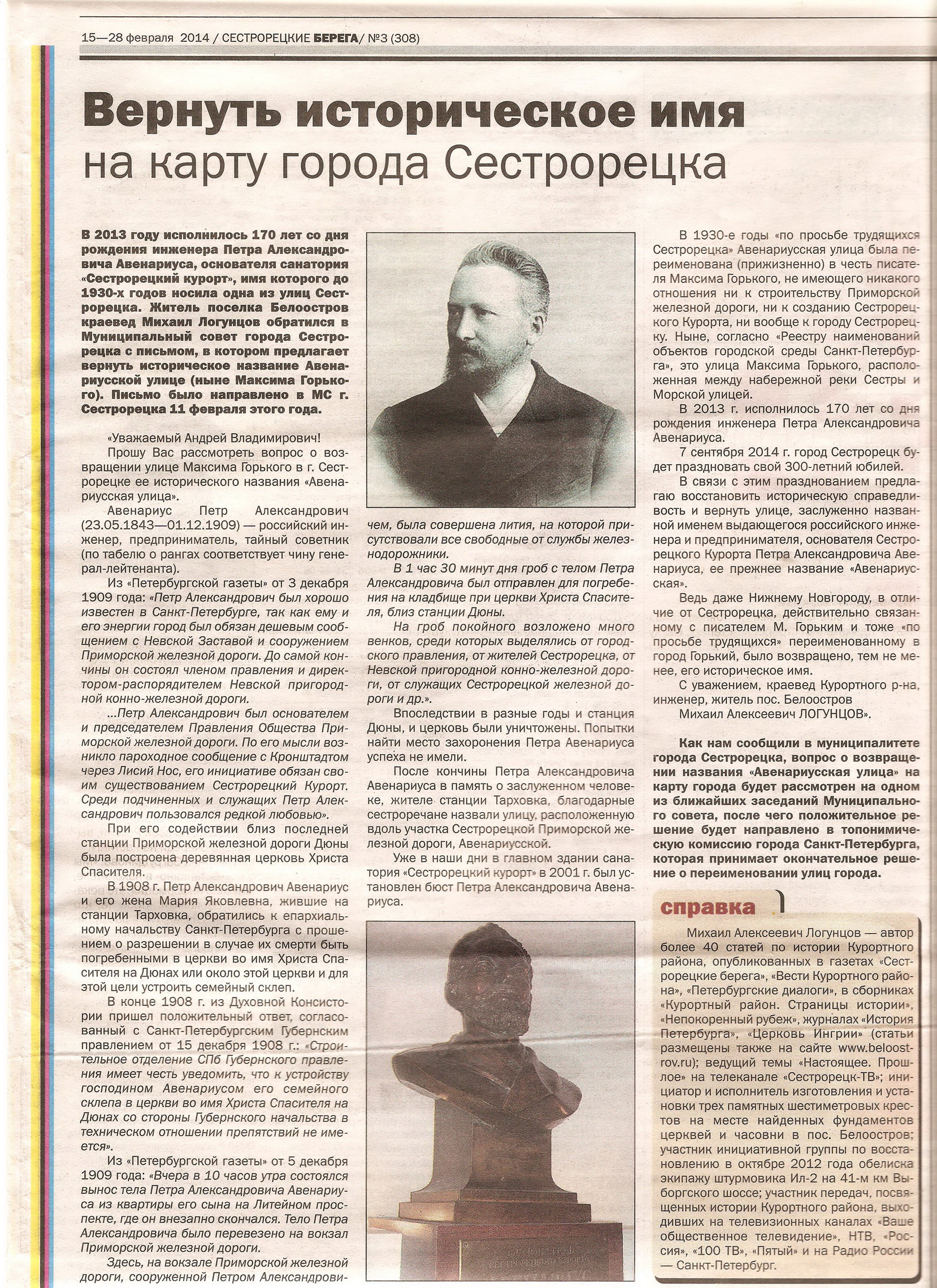 Прошу Вас рассмотреть вопрос о возвращении улице Максима Горького в г.Сестрорецке её исторического названия «Авенариусская улица».