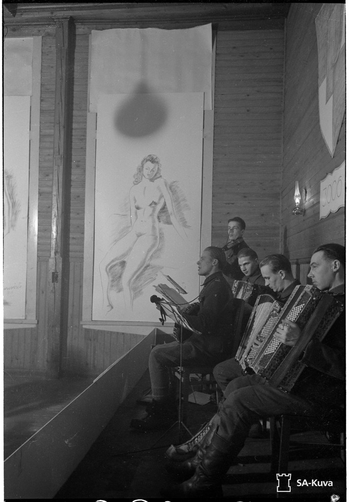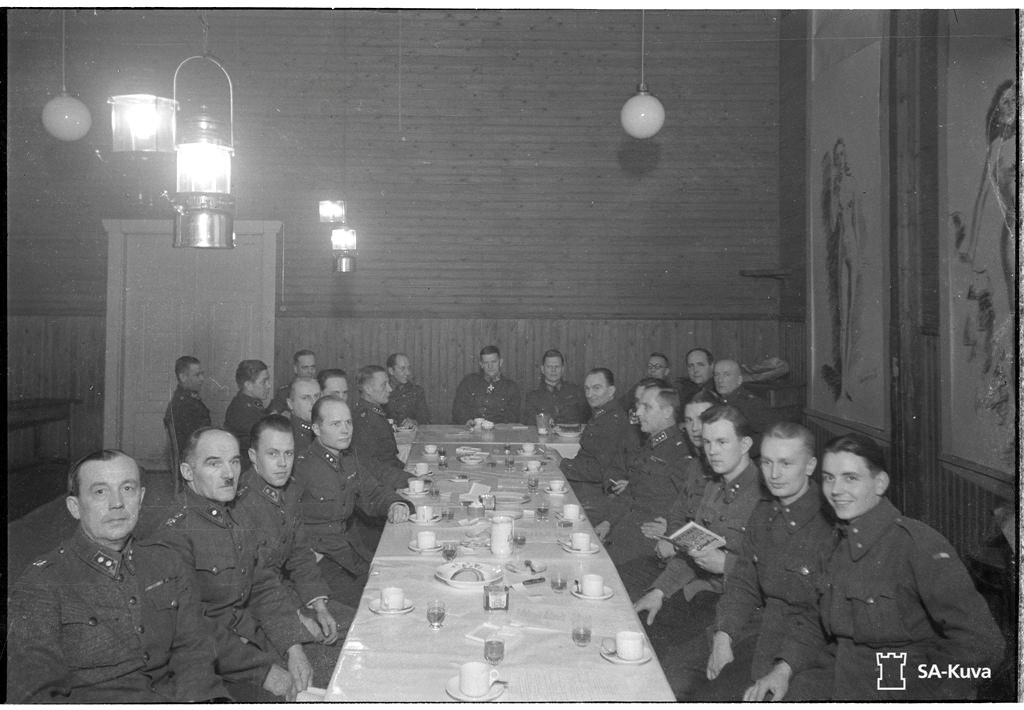 В обновлениях есть несколько фотографий, сделанных в расположении частей генерала Паяри (27 полк) . И если первая (празднование Рождества) снята в Александровке, в какой-то обычной избе, то вторая - в достаточно большом помещении с высокими потолками и отделанными стенами. Забавно, что если на сохранённой превьюшке открывается подпись "sotilaiden kahvitilaisuus", т.е. "солдатская кофейня", и это вполне соответствует фривольным картинкам на стенах, то при просмотре непосредственно в SA-kuva видим подпись "командный пункт 27 п.п.".