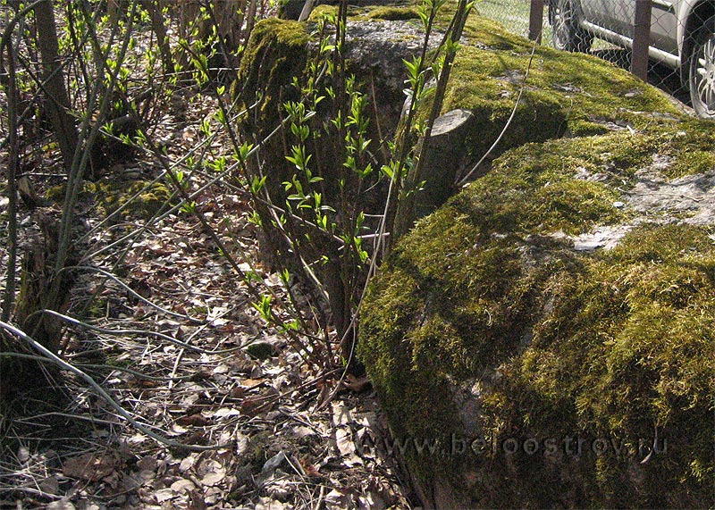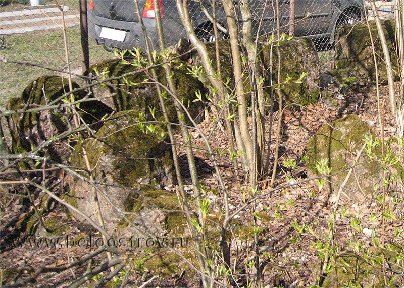 Картина, конечно, печальная: камни все поросли мхом, сам фундамент разделён почти пополам дорогой, по обеим сторонам которой естественно расположились садоводческие участки. В некоторых частях фундамента он находится непосредственно на участках.