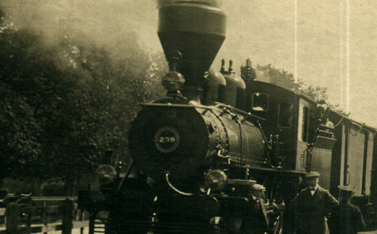 На переднем плане открытки паровоз №239 и рядом стоят указанные двое мужчин в кепках