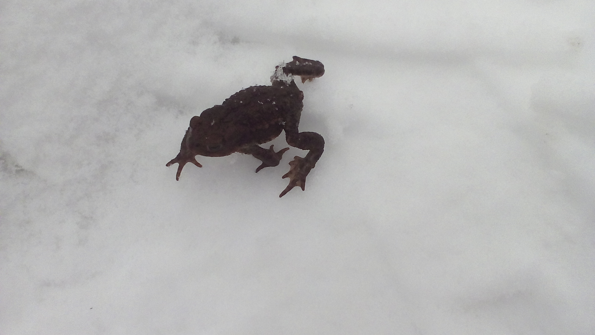 Вчера во время лыжной прогулки встретил на тропе в лесу живую лягушку.