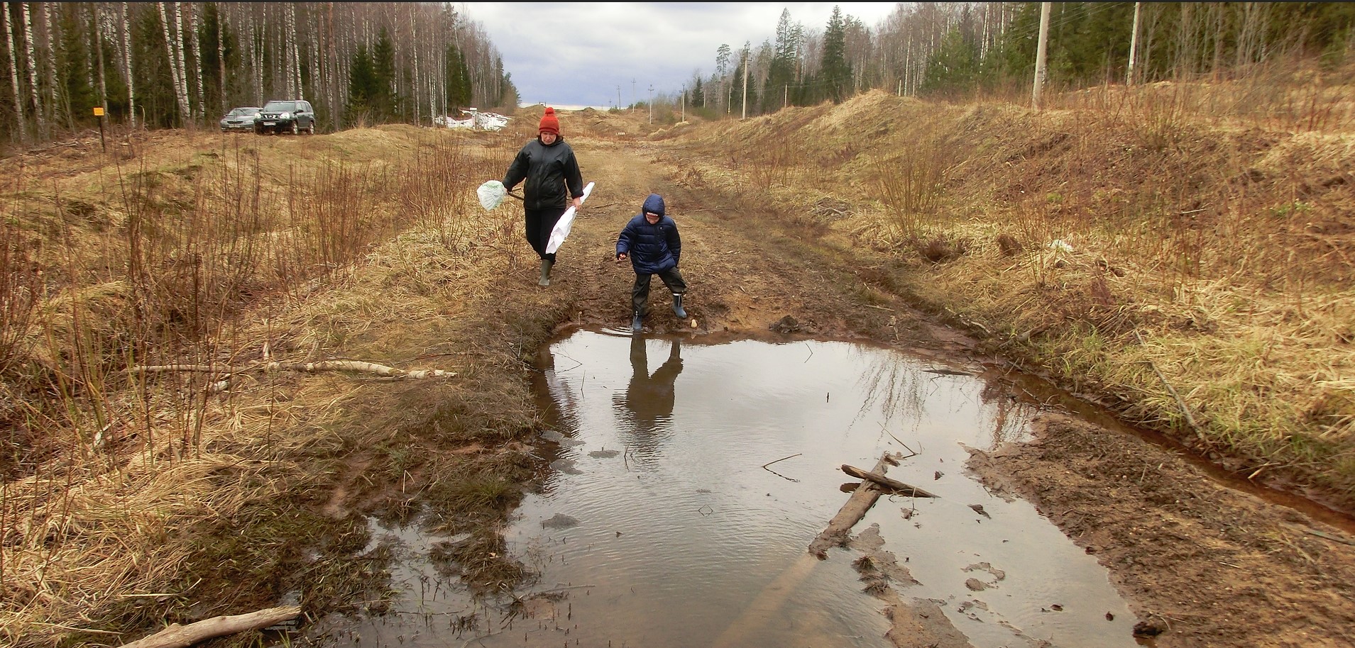 Как и было обозначено выше, к месту сбора на развилке дороги прибыли ( с примкнувшими товарищами) заранее в 10.54. Никого... Ау по телефону не получилось. Коллеги были недоступны. В 10.59, решив, что коллеги могли уехать раньше, собрав уже всех желающих, двинулись в одиночку. Конечно, к своим танкистам. По пути заехали на могилу у Пасторского. Там можно проставить 5 с плюсом. Все облагорожено и подметено прямо от дороги наверх к могиле. Цветы положены. Дальше через газопровод дорога ничего себе, и в горку за ним нормально. Но вот на спуске ждала засада из упавшей поперек березы. Её только пилить, т.к. макушка упала между деревьями. Повернуть вдоль дороги невозможно. Пришлось остановиться на газопроводе и идти пешком. По газопроводу дорога вполне норм, но сама 1 танковая в жутком состоянии. Проехал какой-то трактор и разворотил всё. Тут же следы каких-то камазов. Все в нерастаявшем снегу и грязи.