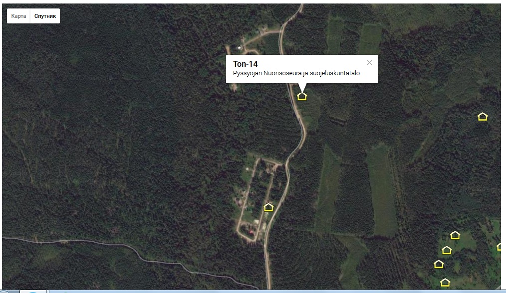 от перекрестка по дороге мимо школы в сторону Хартонен, слева хутор Хакулайнен (Ныне ПКС Андреевский флаг), далее справа Pyssyojan Nuorisoseura ja suojeluskuntatalo (Молодежный клуб и Белый дом. что такое Pyssyojan?)