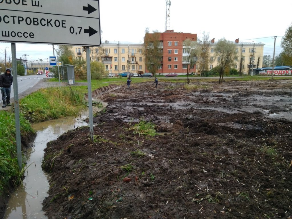 Вырублен кустарник, болотце почти все засыпано. Присутствует экскаватор, несколько нерусских работников)