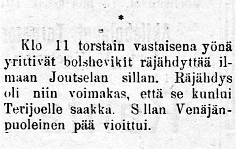 "В 11 часов вечера в четверг большевики пытались взорвать Йоутсельский мост. Взрыв был настолько сильным, что он был слышен в Терийоки. Начало моста с российской стороны было повреждено."