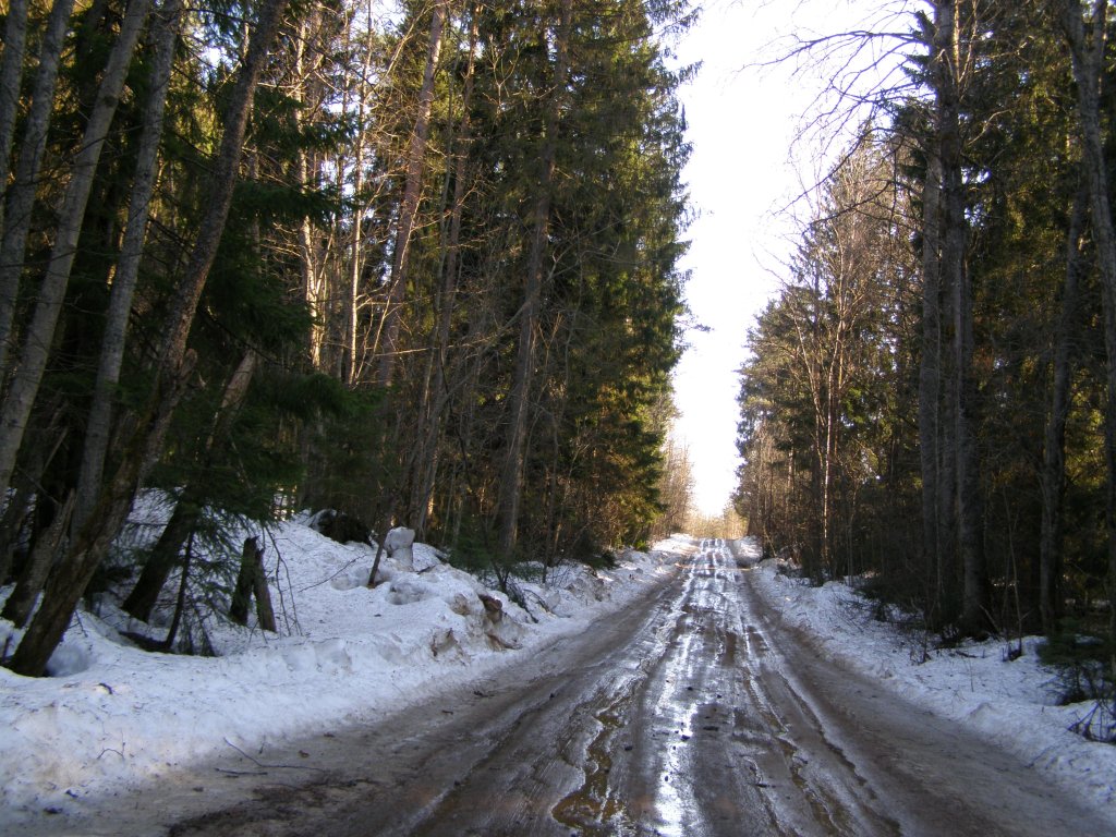 А вот узенькие линии, особенно те что в тени, у леса - еще очень сырые и мягкие, размесить даже Матизом - нефиг делать, не говоря уже о ГАЗелях и всем что тяжелее. Да и снег на них местами еще лежит.