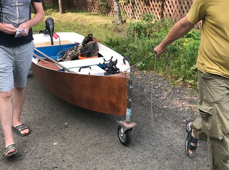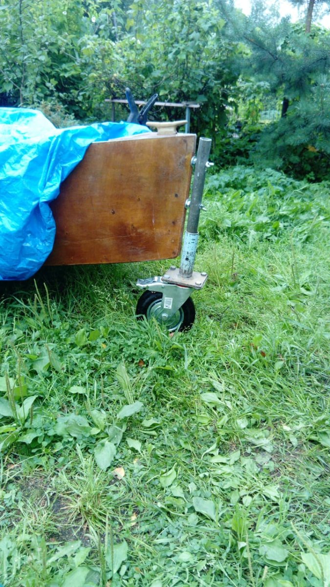 На транец лодки пришуруплены болтами колеса от надувной лодочки, а на штевень... как у прицепа опорное колесо, так же закрепляется на барашки доп. ось...